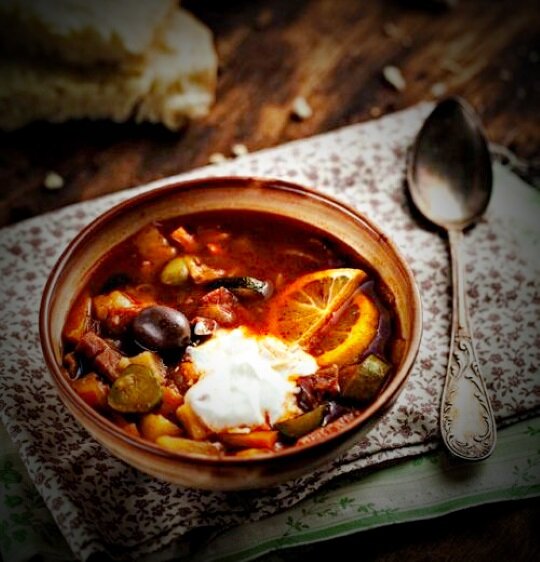 Солянка – традиционное русское и украинское блюдо. Вариантов приготовления много, но в целом это суп с мясным, рыбным или грибным бульоном и различными специями. Солянка обычно имеет кисло-солено-пряную основу за счет добавления таких компонентов, как соленые огурцы, оливки, каперсы, лимоны и сметана. Будем готовить мясную солянку с грибами.