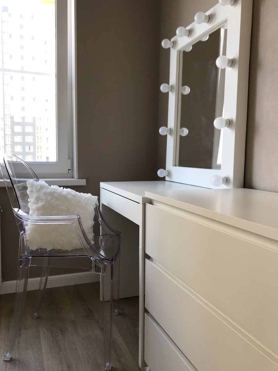 Туалетный столик в спальне был неотъемлемой частью при планировке квартиры. Обратили внимание на популярный компьютерный стол Микке из Икеи.