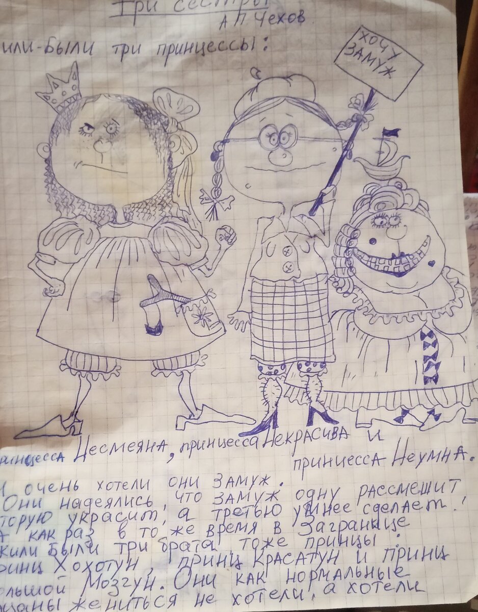Жили были три принцессы: Несмеяна ,Некрасива и Неумна. И очень хотели они замуж. Они надеялись,что замуж одну рассмешит, вторую украсит,а третью умнее сделает. А ,как раз,в то же время в Загранице жили три брата- тоже принцы. Принц Хохотун,принц Красатун и принц Большой Мозгун.