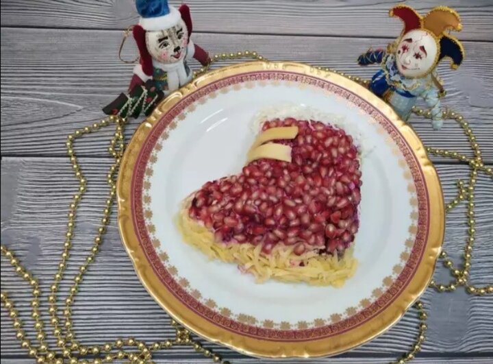 На верхний слой выкладываем зерна граната. Подошву сапога оформляем тертым сыром. А мелко натертым белком оформляем верхушку сапога.