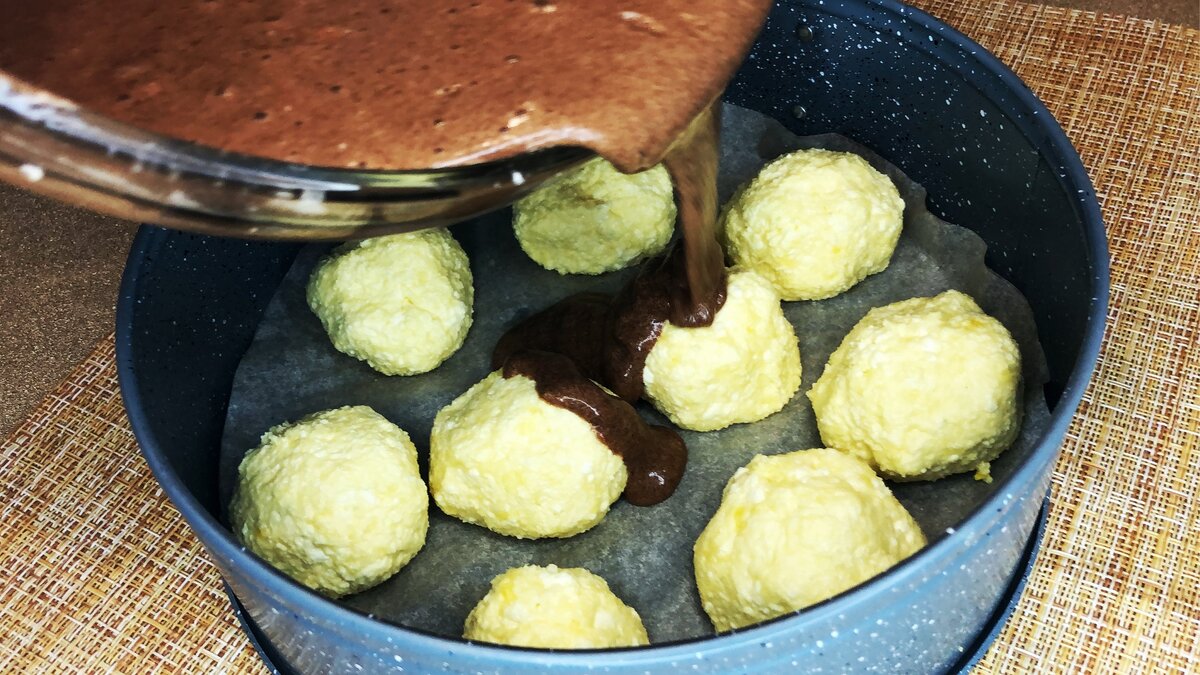 Заливаем полученным тестом творожные шарики и ставим в духовку при температуре 180 градусов выпекаться на 30-40 минут.