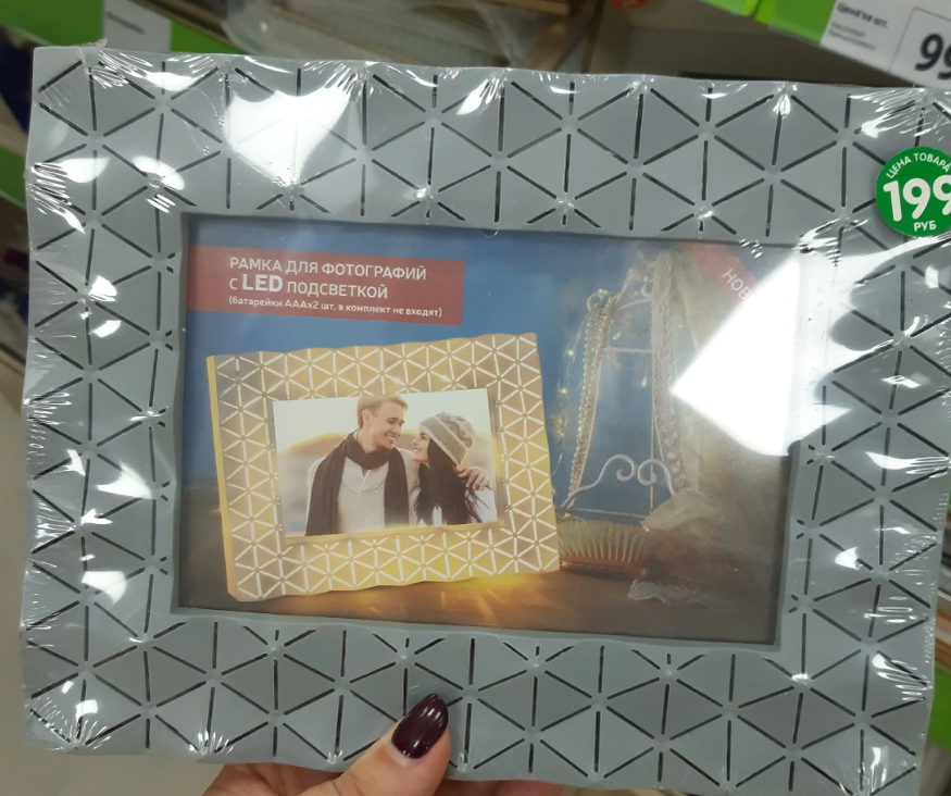У рамки есть подсветка. Батарейки в комплект не входят. Отличное украшение.
