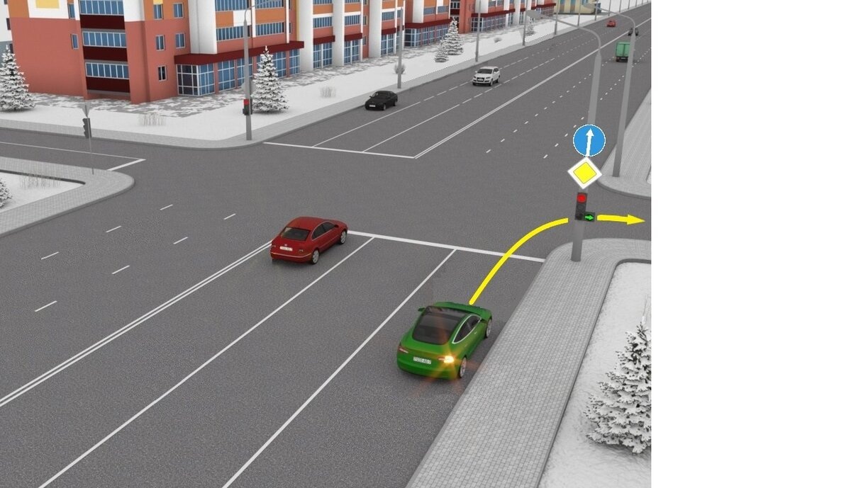 Так как наш зеленый автомобиль не является маршрутным транспортным средством, ему в этой ситуации можно ехать только прямо, после разрешающего сигнала светофора.