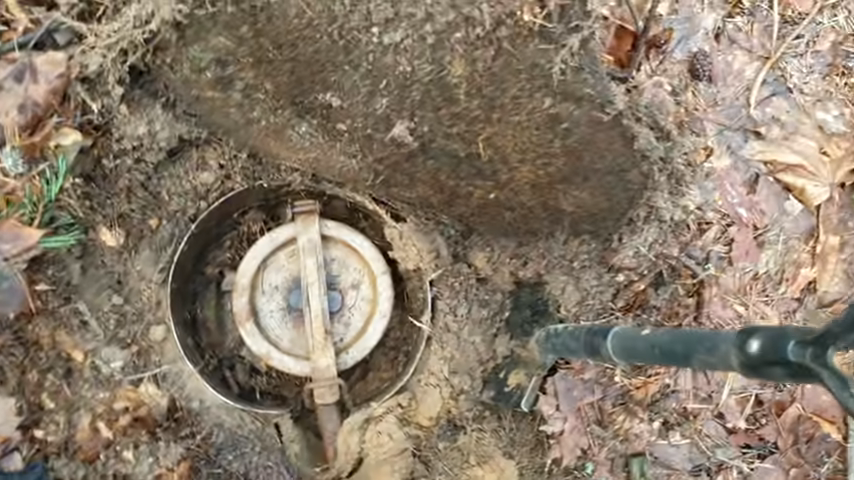 После долгих поисков, я наконец-то услышал заветные звуки и начал раскопки. Сначала я нашёл только один "Схрон" в виде бидона, который был засунут в бочку и хорошо замаскирован. Он лежат тут со времен 1996-го года. По телу пробежали мурашки, от предвкушений и трепета. Этого не передать словами.