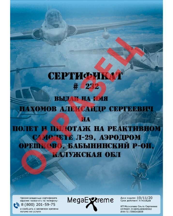 Образец подарочного сертификата на полет на реактивном самолете Л-29
