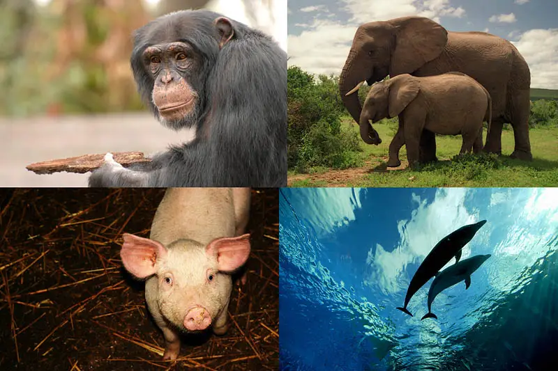 Очень умными животными оказались дельфины. Афалины обладают огромной корой головного мозга, больше чем у человека. Они способны обрабатывать большой объем сложно организованных данных, распознают себя в зеркале и общаются между собой на достаточно сложном языке.
