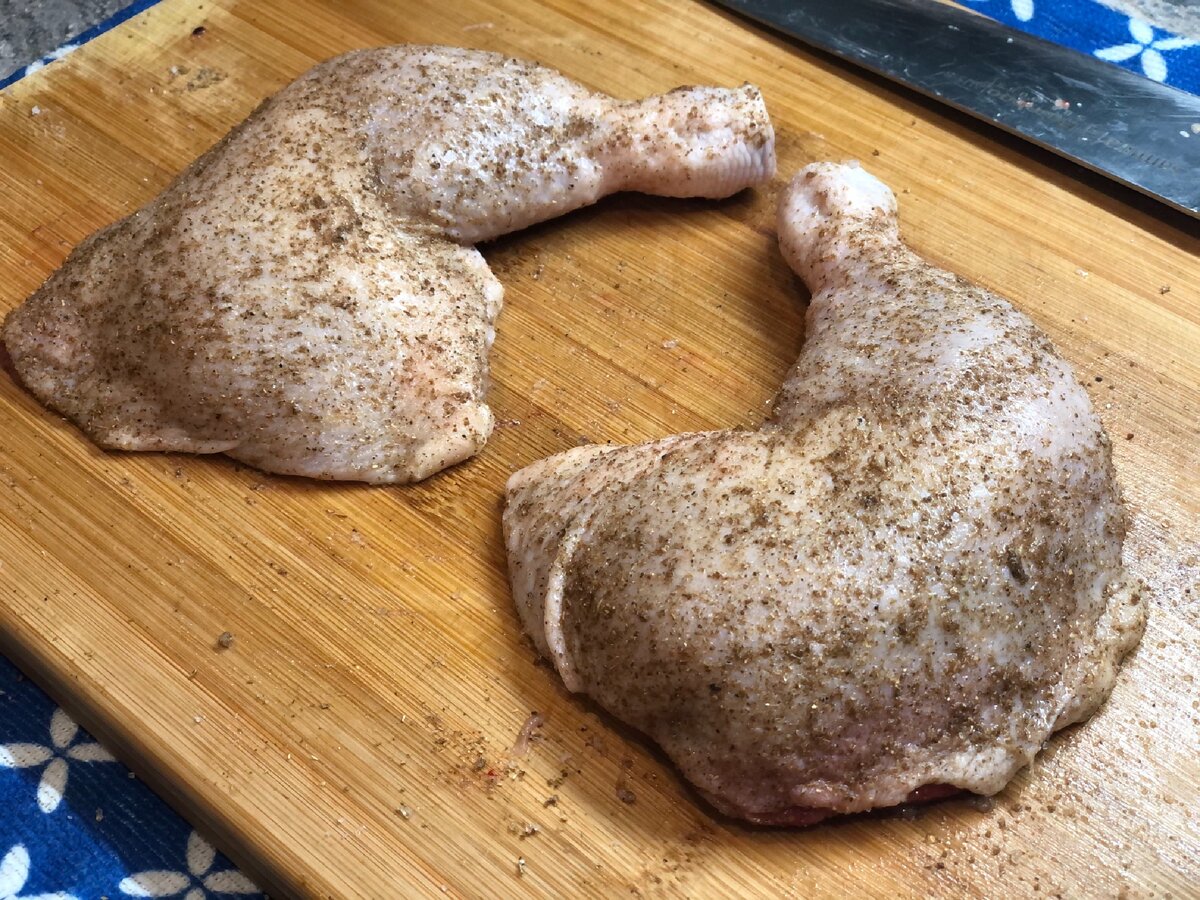 Для начала замаринуем курочку сухим способом. Посолим и обваляем в специях. Оставим минут на 20-30.