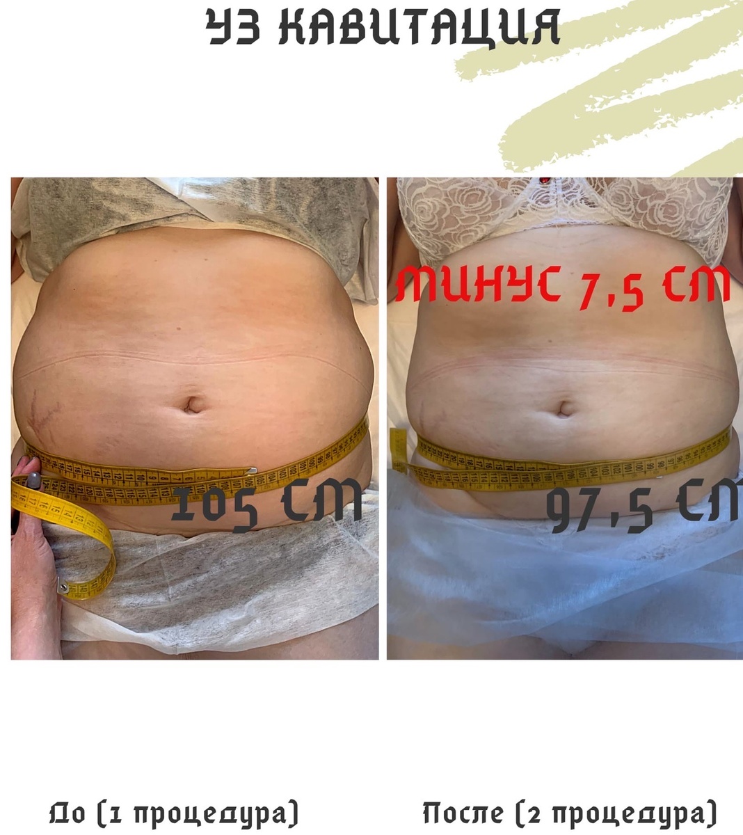 Уже после первой процедуры кавитации даже невооруженным глазом можно заметить положительные сдвиги, ведь за один сеанс из организма выводится до 15 см3 жира! Наибольший эффект достигается после 3 – 4 процедуры.