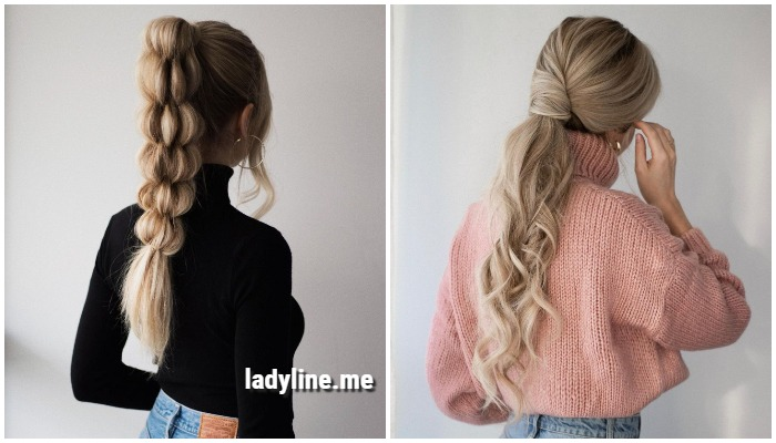 Высокий хвост, выполненный из длинных волос можно разнообразить и сделать визуально современней и романтичней с помощью тонких силиконовых резинок. Разделите всю длину хвоста на равные части завяжите их бесцветными резинками и хаотично распушите пробелы между резинками, получится эффектный объемный хвост, который можно использовать для любого праздничного мероприятия или для романтического вечера.