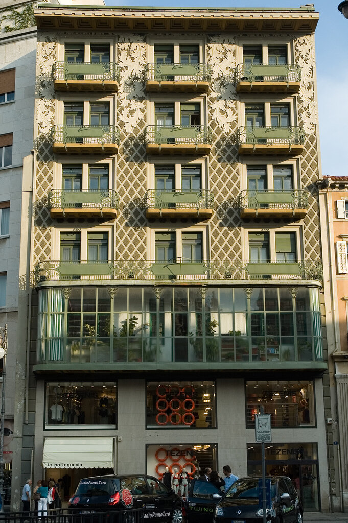 Как мы знаем, в Италии стиль, известный у нас как модерн, назывался "Либерти", а в Австрии было свое очень крутое ответвление - "Сецессион". Так вот, сегодняшнее наше здание построено именно в этом стиле, а Италия тут притом, что в 1906 году, когда было построено это здание, город Триест, на площади которого он расположен, был частью Австрийского Приморья. После окончания Первой мировой войны