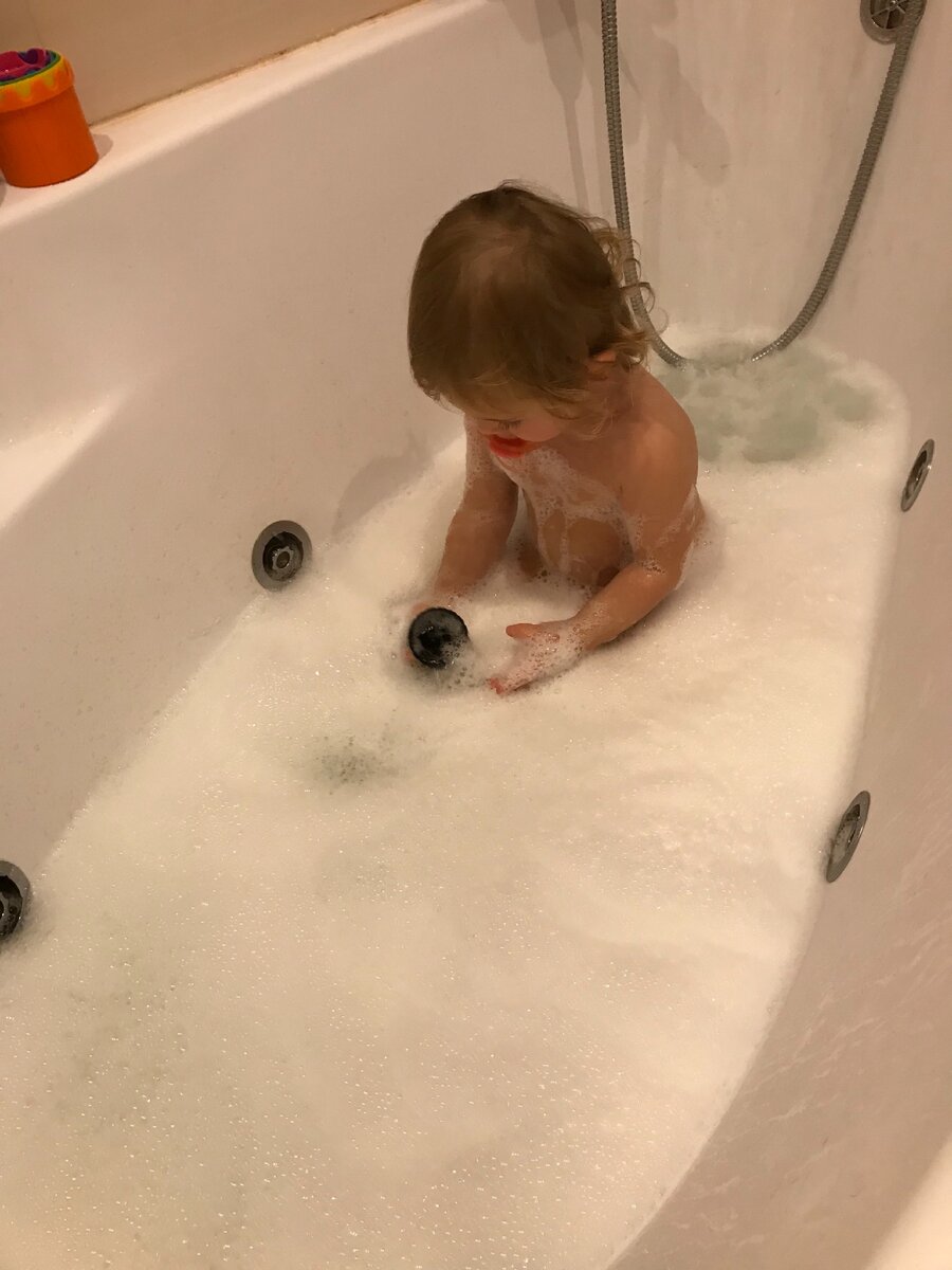 Недавно мы ездили в гости к друзьям с ночёвкой, а у них нет ванны, только душевая кабина, мы не растерялись и поставили дочке тазик) Счастью не было предела, правда сначала она не очень поняла, почему так мало места, но потом освоилась и с радостью плескалась. Я задумалась, что наверное очень сложно родителям у которые есть только душевые кабины, все же плавание в большой ванне с пеной - это особый кайф❤️