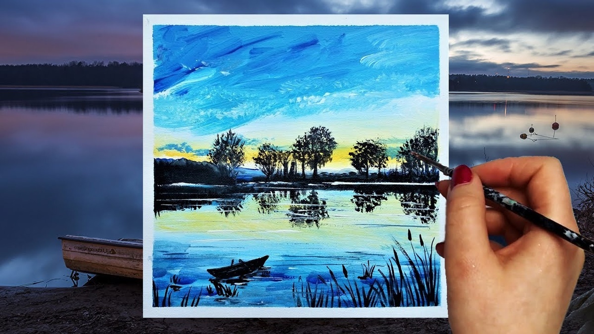 Идея нарисовать сказочный пейзаж озера акриловыми красками на холсте.