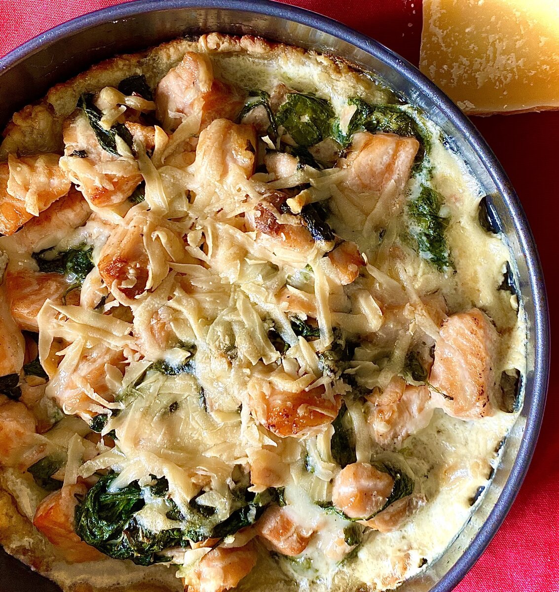 6. Начинку выливаем в основу и посыпаем тертым пармезаном. Выпекаем ещё 20 минут, до образования красивой корочки.