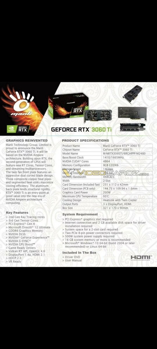 В руки источника попала версия видеокарты от Manli. В основе видеокарты лежит чип GA104-200 с частотой 1410 МГц, в турбо-режиме эта цифра достигнет 1665 МГц. Новинка предложит 4864 ядра CUDA и получит 8 Гбайт GDDR6 с 256-битной шиной и пропускной способностью до 448 Гбайт/с. Видеопамять будет функционировать на эффективной частоте 14 000 МГц. TDP будет составлять 200 Вт.