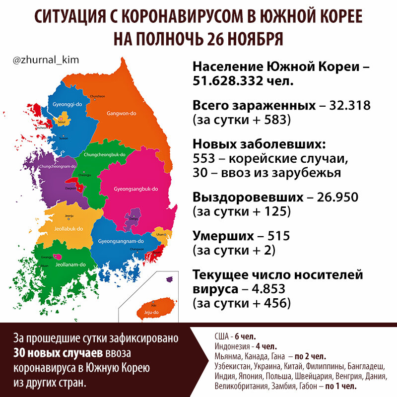 Ситуация с коронавирусом в Корее резко ухудшилась. По состоянию на 00:00 часов 26 ноября было зарегистрировано 583 новых зараженных, из которых 553 чел – местные случаи заражения и 30 – привезенные из-за границы.