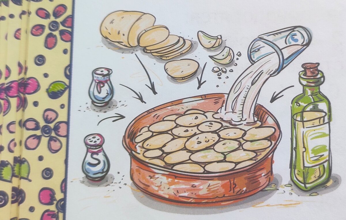 На днях мы дошли до раздела с рецептами. Описано всё довольно просто, понятным, для юной леди, языком. Набор рецептов незамысловатый: здесь описаны и десерты, и салаты, и первые блюда. Из вторых блюд заинтересовал (даже меня) рецепт картофельной запеканки.