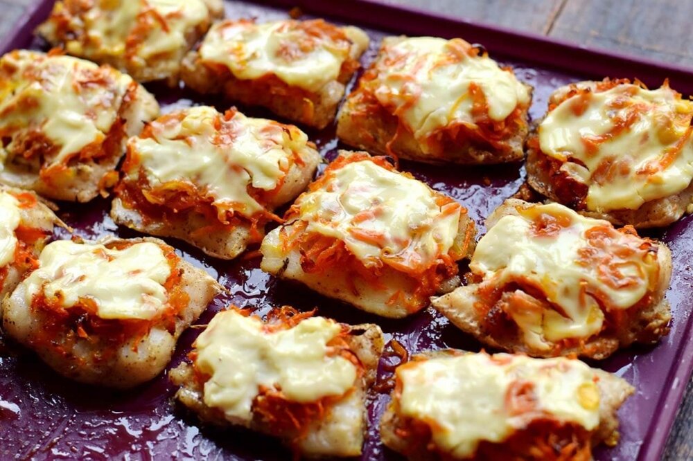 Запекаем рыбу в духовке с овощами и сметаной. Используем филе минтая, также подойдет хек или другая рыба без мелких костей. Филе запекается небольшими порционными кусочками под овощной шубой. В качестве овощей берем лук и морковь, пассеруем их в масле для мягкости. Перед запеканием овощи покрываем сметаной. Благодаря овощам и сметане, рыба получается очень сочной, ароматной, имеет аппетитный внешний вид и новый вкус. Обязательно приготовьте рыбу по данному рецепту, это очень вкусно. Приготовление: Минтай заранее разморозьте, ополосните, промокните салфетками. Каждую тушку разрежьте на 2 продольные части, отрежьте плавники, аккуратно отделите хребет от мяса, удалите все кости. У вас должно получиться 6 рыбных филе. Каждое филе разрежьте поперек на 2 порционные части. Филе сложите в глубокую емкость, приправьте молотым перцем и сольи, перемешайте, чтобы специи окутали каждый кусочек. Оставьте рыбу мариноваться в специях. Тем временем подготовьте овощи. Лук очистите, нарежьте кубиком, зак