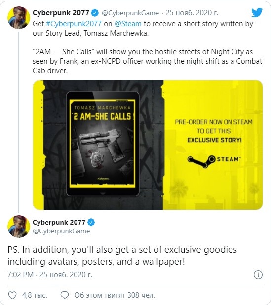 CD Projekt RED сообщает, что предзаказчикам Cyberpunk 2077 в Steam полагается эксклюзивный бонус — рассказ 2AM — She Calls. Произведение написал ведущий сценарист игры Томаш Мархевка (Tomasz Marchewka).