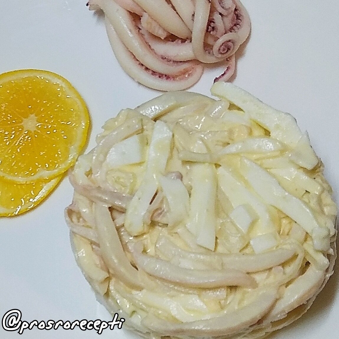 Это лучший рецепт из кальмаров! Салат получается очень вкусный, нежный, а главное — низкокаллорийный. Уверена, вам понравится! Ингредиенты: ⏺️4 шт. тушки кальмаров ⏺️7 яиц ⏺️2 крупных луковицы ⏺️200 мл. воды, 4 ст.л. уксуса, 1 ст.л. сахара (для маринования лука) Приготовление👇 ➡️Лук очистить, нарезать тонкими четверть кольцами. Поместить в глубокую тарелку, залить водой, добавить уксус, сахар и перемешать. Оставить мариноваться на 2 часа. ➡️Кальмары очистить от шкурки и внутренностей под холодной проточной водой. Отварить в кипящей подсоленной воде 2 минуты. Остудить, нарезать тонкой соломкой. ➡️Яйца отварить, остудить и нарезать соломкой. ➡️Смешать все ингредиенты, заправить греческим йогуртом или майонезом. Приятного аппетита 🍴🤗♥️ Вопросы и отзывы пишите в комментариях 👇
