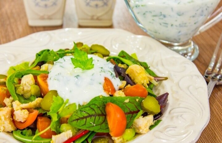 Вместо йогурта можно использовать сметану, но очень советую попробовать приготовить заправку на основе йогурта.