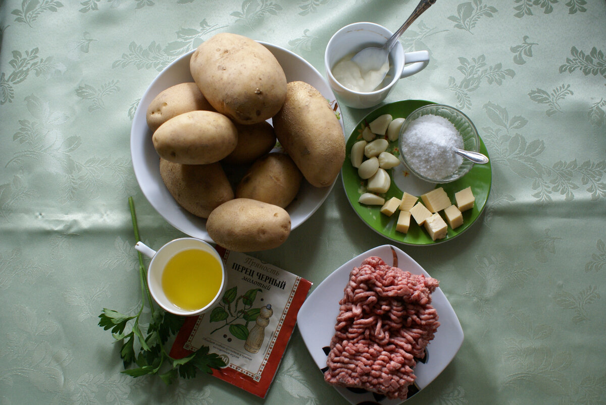 д) выложить поверх картофеля и чеснока слой фарша. Стараясь, чтобы слой получился равномерным;
