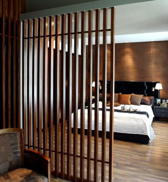 Не менее часто используют материал для зонирования пространства. Обычно делают специальную реечную конструкцию, которая визуально разграничивает пространство, но при этом оставляет естественный свет. Чаще всего такое решение используется для создания: