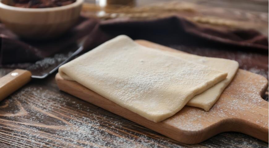 Подпылите стол мукой, если тесто нужно раскатать. Делайте это строго в одном направлении, для сохранения его текстуры. Слоёное сырое тесто всегда нужно нарезать только самым острым и тонким ножом, чтобы не смять и не «запечатать» слои, В этом случае они не смогут раскрыться при выпечке и тесто утратит воздушность.