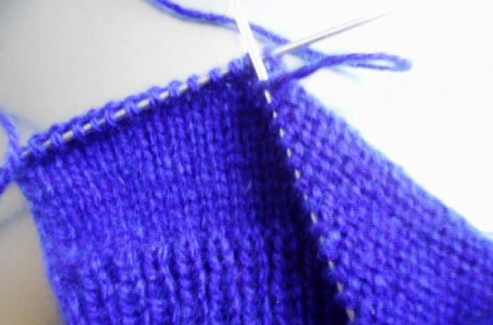 Рабочая спица вводится в петлю предыдущего ряда с заднего края (см. фото). Далее рабочей спицей захватывается нить, и протягивается через петлю предыдущего ряда.