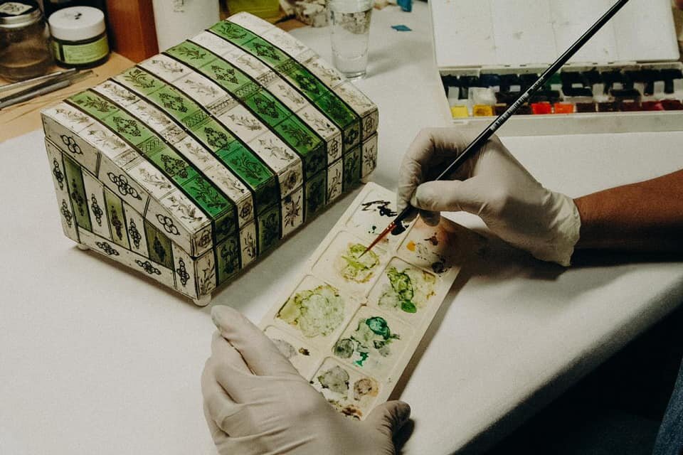 Все утраченные элементы были восполнены по аналогии с авторскими. Утраченные ножки реставратор восполнила по косвенной аналогии, а для нанесения глазкового орнамента изготовила специальный инструмент. Все восстановленные элементы смонтированы на прежние места. Завершающий этап —нанесение реставрационных тонировок (на фото).⠀