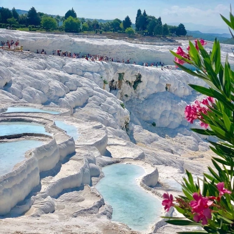 Памуккале в Турции – известный термальный источник, расположенный в юго-западной части страны. В его воде чрезвычайно много карбоната кальция, который за тысячелетия помог сформировать естественные террасы, ванны и сталактиты.