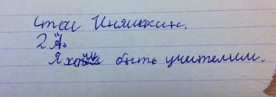 P.S. Не так давно мне написала моя одноклассница, с которой мы учились в первом классе. Она стала учительницей в нашей школе. Разбирая шкафы в классе, она нашла небольшую коробку, куда мы складывали записки, кем мы хотели быть (знаю, что звучит нереально, сам бы не поверил). Она прислала фото моей записки. Мне было 7 лет. До этого случая был уверен, что в детстве я хотел быть зубным врачом. На ней было написано: "Стас Иняшкин. 2"А". Я хочу быть учителим". Судьба?