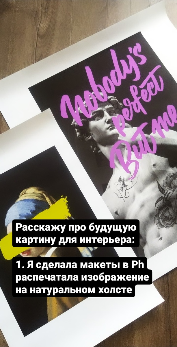 1. Выбор изображения. Это может быть фото или репродукция. Картинка должна быть большой, чтобы растянуться на размер будущей картины, без потери качества. Я выбрала фото скульптуры Давида, Микеланджело. В фотошопе сделала фото черно-белым, добавила татуировки на тело и розовую надпись.