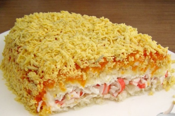 Выложить слоеный салат с крабовыми палочками.