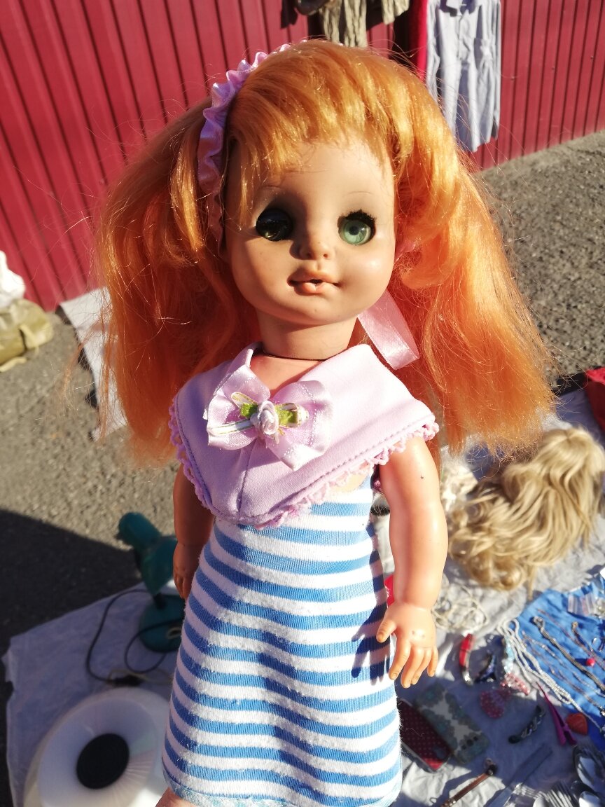 Уже подходя к нашему Владикавказскому "Привозу", всё стало понятно - день обещает быть насыщенным и интересным. Количество собравшихся машин красноречивей разных предположений и догадок. И я не ошиблась. Сразу же под ногами у меня оказалась старенькая, но уцелевшая куколка из ГДР. Цена на неё была не очень низкая, если учесть состояние игрушки: на голове и на одной ручке начался необратимый процесс "почернение". За куклу просят 200 рублей, начинаю торговаться и с горем-пополам выторговываю этот шедевр из прошлого за 150 рублей. Пока я не решила, как с этой куклой поступлю дальше - буду колдовать над новым образом, или пока отложу в коробочку как запчасть. И всё-же, зная себя, больше склоняюсь к "нелегкому" пути, буду пытаться дать новую жизнь куколке.