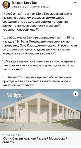 Интернет-сообщество продолжает кипеть и возмущаться над мерзопакостной статейкой The Village (https://www.the-village.ru/city/news-new-place/muzey-zoi-kosmodemyanskoy) про новопостроенный музей Зои Космодемьянской в деревне Петрищево. Место гибели советской патриотки, которая отдала свою жизнь за Родину, охарактеризовано как место, где приятно гулять, пить кофе и делать фото, а также кататься на