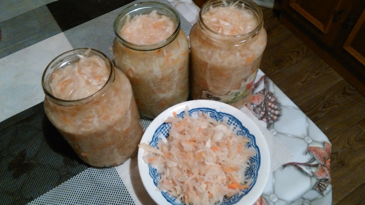 В большую миску выкладываем нашинкованную капусту и натертую морковь хорошо все перемешиваем добавляем воду и соль, и оставляем квасится на 3 суток не забываем каждый день перемешивать, через 3 суток добавляем сахар хорошо перемешиваем и оставляем еще на сутки, а затем закладываем в банки накрываем крышками и ставим в холодное место. Получается очень вкусная и хрустящая.