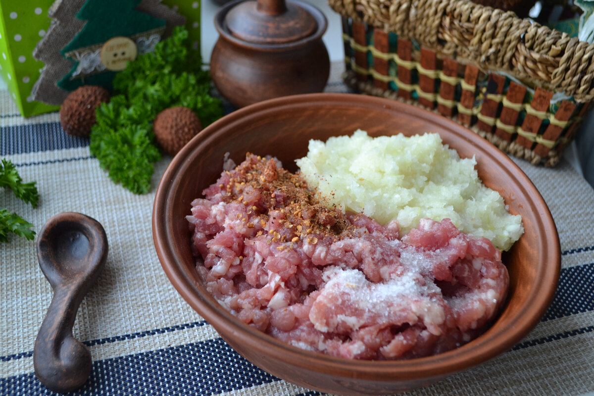 Итак, для начинки использую свиной фарш. К мясу добавляю измельченный комбайном репчатый лук, по вкусу соль и смесь молотого перца.