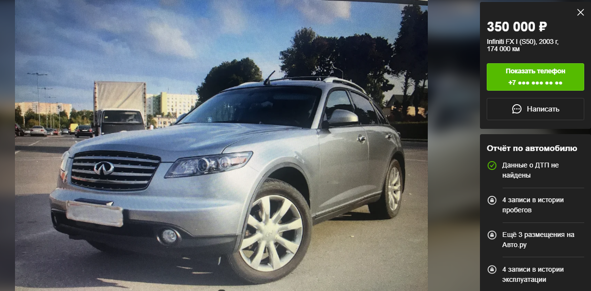 3. Infiniti FX. Не смотря на возраст, выглядит он довольно брутально, да и цена варируется от 350 тысяч рублей. Дорогие комплектации и надежные атмосферники делают свою работу!