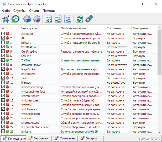 Внизу — четыре кнопки, которые позволяют включить состояние служб по умолчанию, безопасный вариант отключения служб, оптимальный и экстремальный. Планируемые изменения сразу отображаются в окне, а по нажатию левой верхней иконки (или выборе в меню «Файл» — «Применить настройки»), параметры применяются.
