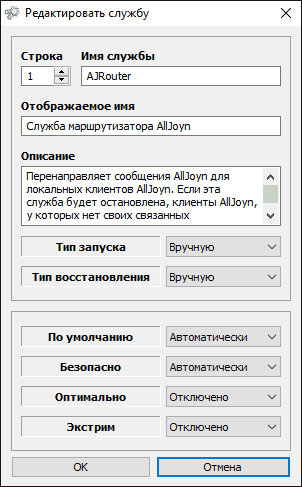 По двойному клику по любой из служб, можно увидеть ее имя, тип запуска и безопасные значения запуска, которые будут применены программой при выборе различных ее установок. Помимо прочего, через контекстное меню по правому клику на любой службе вы можете удалить ее (не советую).