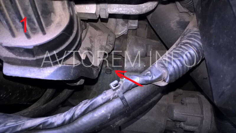 В первую очередь необходимо слить охлаждающую жидкость. Находим на блоке двигателя пробку сливного отверстия (фото 1). Подставляем под двигатель ёмкость для сбора тосола и откручиваем пробку (ключ на 13). После чего откручиваем пробку расширительного бачка. Пока жидкость стекает, начинаем разборку.