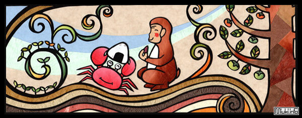 Отправились как-то обезьяна и краб вместе гулять. Нашла обезьяна по дороге косточку персика, а краб - рисовый колобок. Очень захотелось обезьяне съесть рисовый колобок, вот и стала она упрашивать краба поменяться. Уж и так и сяк она краба уговаривала, пока тот наконец не согласился. Схватила обезьяна рисовый колобок, мигом проглотила. А краб персиковую косточку сохранил, домой принес, весной в