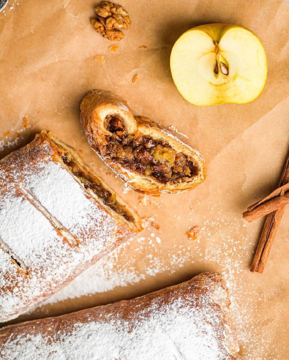 Штрудель - знаменитое лакомство в венских кафе. Кондитеры каждого уголка города непременно готовят этот пряный десерт. Представьте на секунду этот аромат горячего чая или кофе, переплетающееся с запахом яблок с корицей, укутанных в нежное многослойное тесто. На мой взгляд, это идеальное сочетание для осеннего уютного вечера с родными)