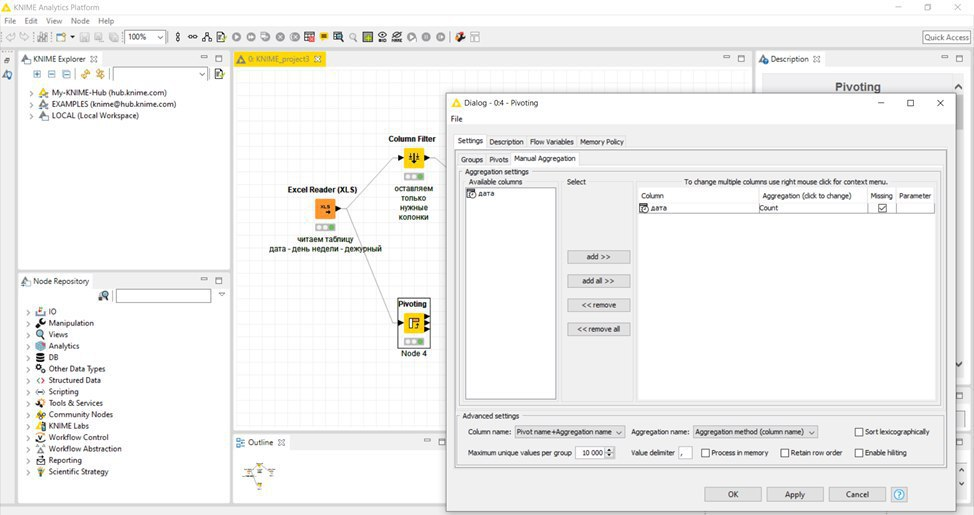 Итак, нам необходимо подсчитать количество отработанных дней на каждого дежурного через ноду Pivoting. Представляем, как это выглядело бы в сводной таблице в экселе. Два столбца: имя и количество. Другими словами: строки – это имена, ∑ значений – это кол-во дней.