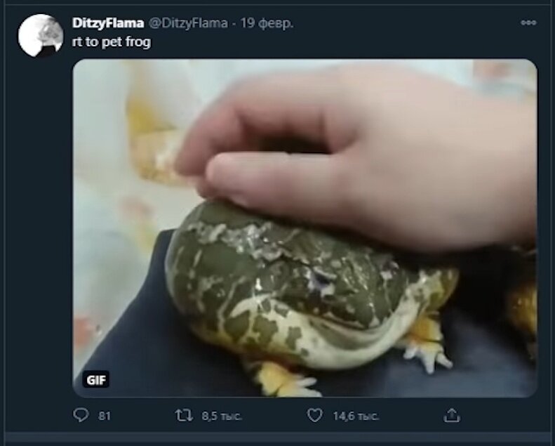 19 февраля пользователь опубликовал Gif-фаил, на котором человек гладил лягушку: