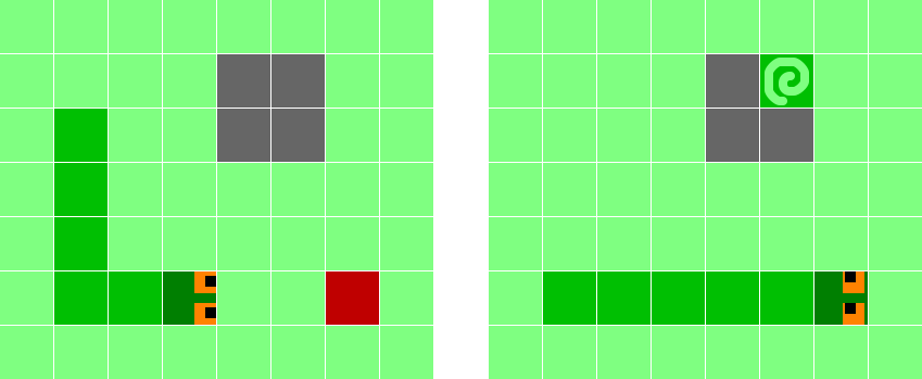 После появления выхода игрок может продолжать играть на уровне, но как только голова питона попадёт в клетку с выходом, уровень закончится.