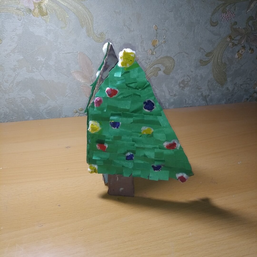 8. Украшаем ватой с двух сторон. Из нее делаем маленькие шарики, макаем в клей ПВА и приклеиваем на елку. ( можно заранее покрасить ватные шарики, обмакнув в воду, окрашенную краской, но в этом случае придется подождать, пока они высохнут)
