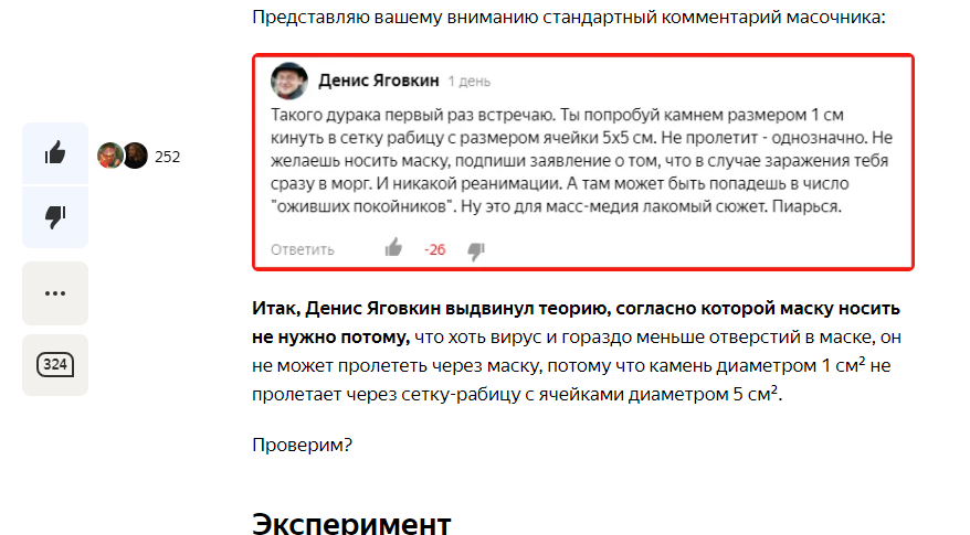 В ней назвавший себя математиком приводит полемику с не слишком адекватным "масочником" и устраивает показательный "разгром" с применением "математики", экспериментов и прочих атрибутов науки: