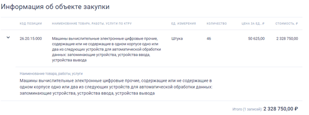 Итак, предметом закупки является «26.20.15.000 Машины вычислительные электронные цифровые прочие, содержащие или не содержащие в одном корпусе одно или два из следующих устройств для автоматической обработки данных: запоминающие устройства, устройства ввода, устройства вывода», говоря простым языком – компьютеры.