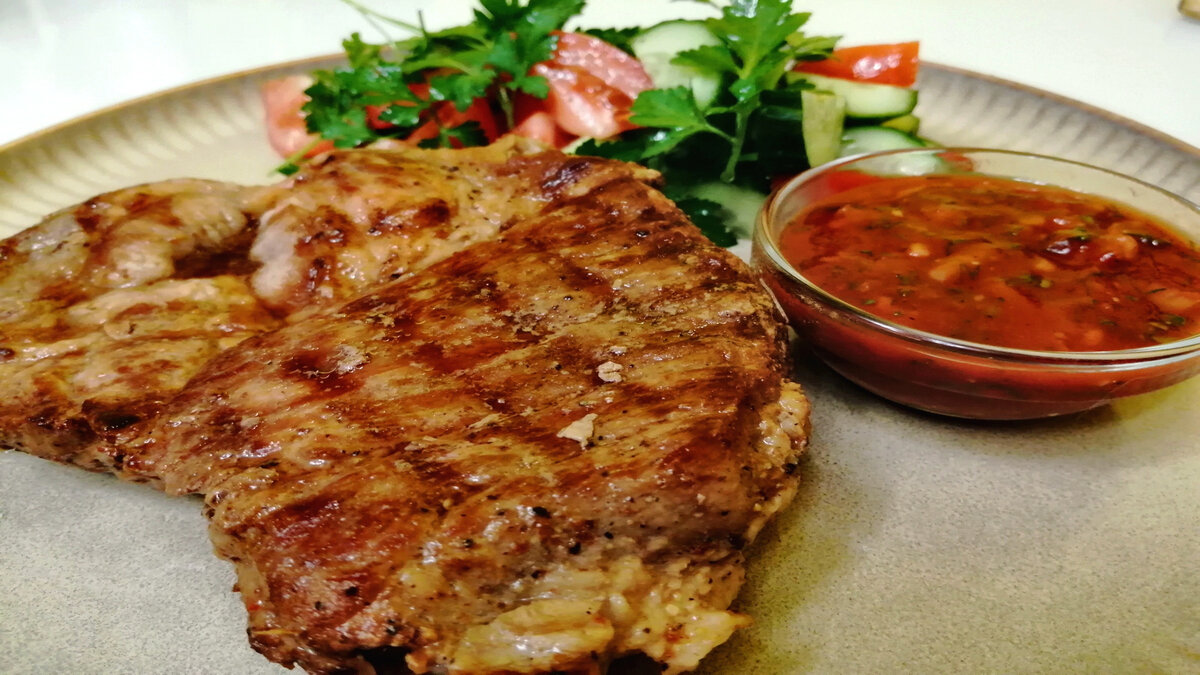 Стейк из свиной шеи - это толсто порезанный и обжаренный кусок мяса с тонкими жировыми прожилками. Он прекрасно сочетается с запеченными, свежими или отварными овощами и может стать прекрасным вариантом для семейного ужина. ********************* **Рецепт** Свиная шея 320гр Пиво 200мл Соевый соус 30мл Чеснок 3зб Масло растительное 20мл Соль по вкусу Перец по вкусу **Салат овощной** Помидора 100гр Огурец 80гр Зелень Соль и перец по вкусу **Соус томатный к мясу (Видео рецепта https://youtu.be/rWSkxihUbGY) ********************** * Посмотрите ВИДЕО ЭТОГО РЕЦЕПТА на моем YouTube канале "Игра вкусов" * Подписывайтесь!!! https://www.youtube.com/channel/UC-2-5_LEQ0f8H0O-u3Y5hvA?view_as=subscriber Впереди вас ждет много рецептов) Подготовить все ингредиенты для приготовления. От свиной шеи отрезаем хороший, толстый стейк. Для маринада понадобится соль, перец, специи, соевый соус, пиво. Мясо оставляем в маринаде на 1,5часа. Пока мясо маринуется сделаем овощной салат. Это будет н